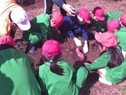 10月23日(木)天気もよく、春から育ててきたサツマイモを掘りました。みんなでサツマイモを掘ってみると・・・大きなサツマイモが畑の中から顔を出しました。