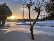 朝日に照らされて妙高山がキラキラとしていました。気温は3度。晴れています...